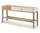 Pés em madeira maciça de fonte renovável com acabamento em verniz natural. Partes laminadas em freijó com acabamento em verniz natural. Partes coloridas em MDF com acabamento em pintura de laca fosca de alta qualidade. Prateleira em palha (Rattan). Gavetas com corrediças telescópicas.