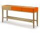 Pés em madeira maciça de fonte renovável com acabamento em verniz natural. Partes laminadas em freijó com acabamento em verniz natural. Partes coloridas em MDF com acabamento em pintura de laca fosca de alta qualidade. Prateleira em palha (Rattan). Gavetas com corrediças telescópicas.