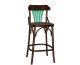 Banqueta em madeira maciça com estrutura torneada e acabamento em verniz, encosto com detalhe colorido em pintura de laca fosca de alta qualidade, considerando o equilíbrio e a ergonomia adequada.